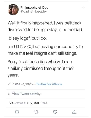 Once my counterpart opted to take the ad hominem route, he needed to find something that would somehow discredit me. Some way to show himself (and maybe others) that what I had to say didn’t matter. He decided to key in on one of the few bits of info presented in my Twitter bio–that I am a stay-at-home dad. So, what does all that mean?