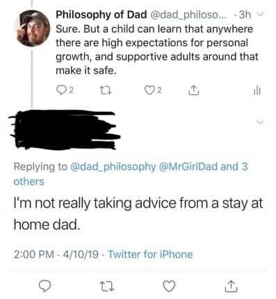 Well, it means that if he’s trying to show my ideas are insignificant via my person or role, he had to pick something that he felt would accomplish this. Which further suggests that, in his estimation, being a stay-at-home dad is insignificant. Put another way, because I’m a stay-at-home parent, my thoughts were not worth considering. Why? Because, from that perspective, a stay-at-home dad couldn’t possibly have anything to offer.